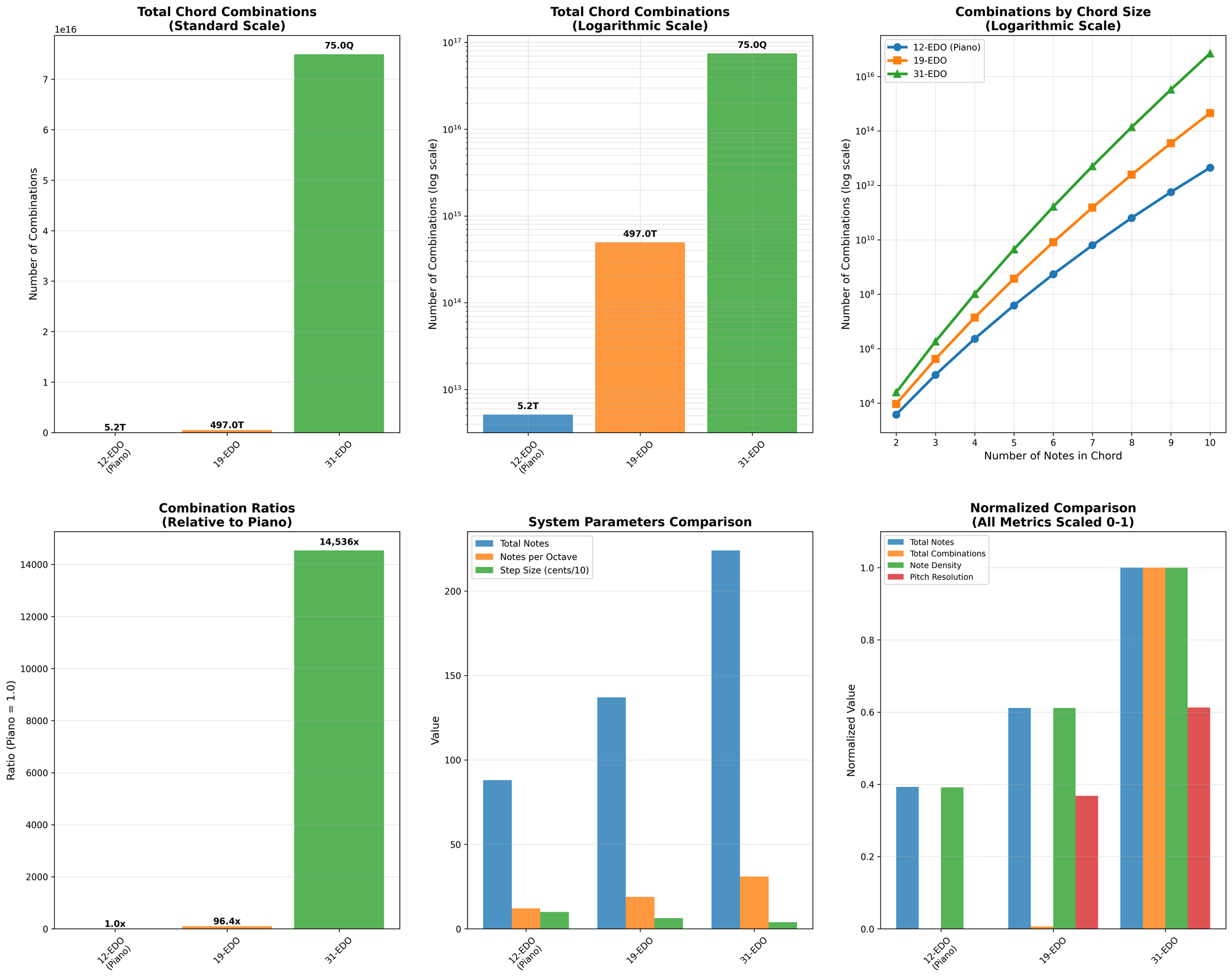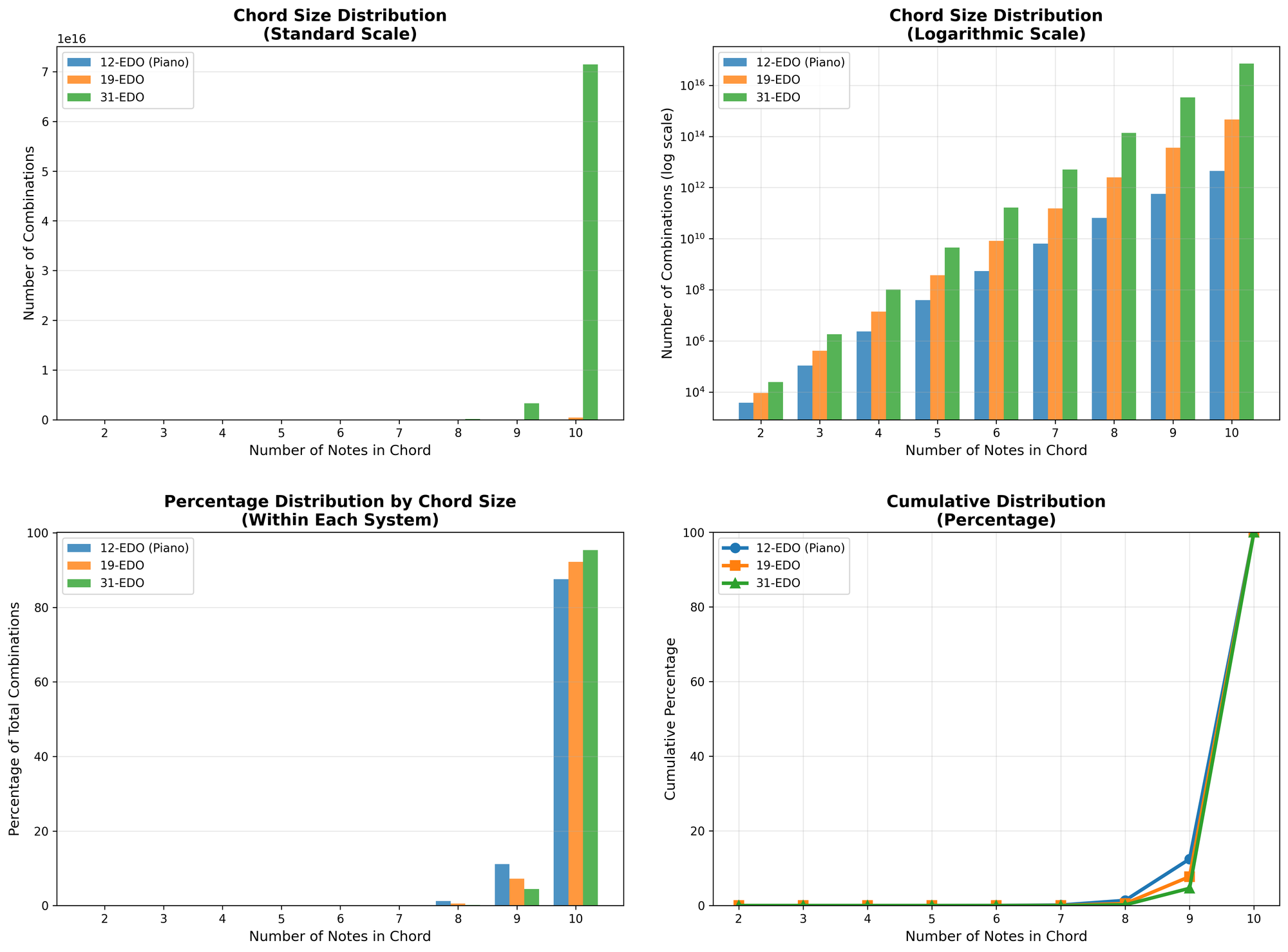"I've completed the comprehensive mathematical analysis of chord combinations across different tuning systems. Here are the key findings:Standard 88-Key Piano (12-EDO):